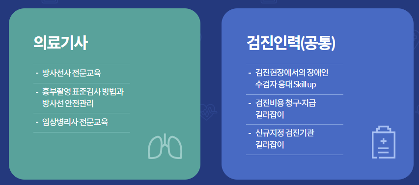 이 교육 시스템은 다양한 분야의 건강검진 교육 과정을 제공합니다. 검진을 담당하는 의사뿐만 아니라 간호사, 방사선사, 행정 직원까지 다양한 직군을 대상으로 한 맞춤형 강의가 준비되어 있습니다.