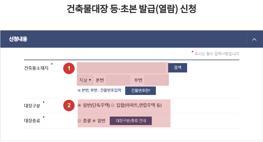 2단계 | 민원 항목 선택 및 정보 입력 | 주소 검색 → 건축물 구분 및 대장 종류 선택 |