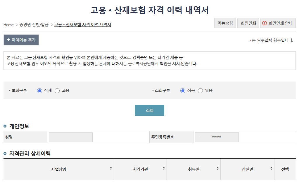 고용보험 피보험자격 이력내역서 발급 (total.comwel.or.kr)
