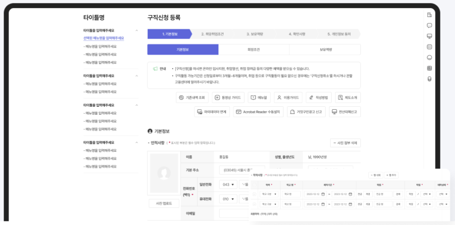 기본 정보를 입력하고 이력서를 등록한 후, 구직신청서를 작성합니다. 이 신청서는 구직자가 어떤 직무를 원하는지, 근무 조건은 어떻게 되는지 등의 내용을 포함한 서류입니다. 구직신청서는 이후 고용 지원 프로그램이나 취업 알선 시 중요한 자료로 활용됩니다.