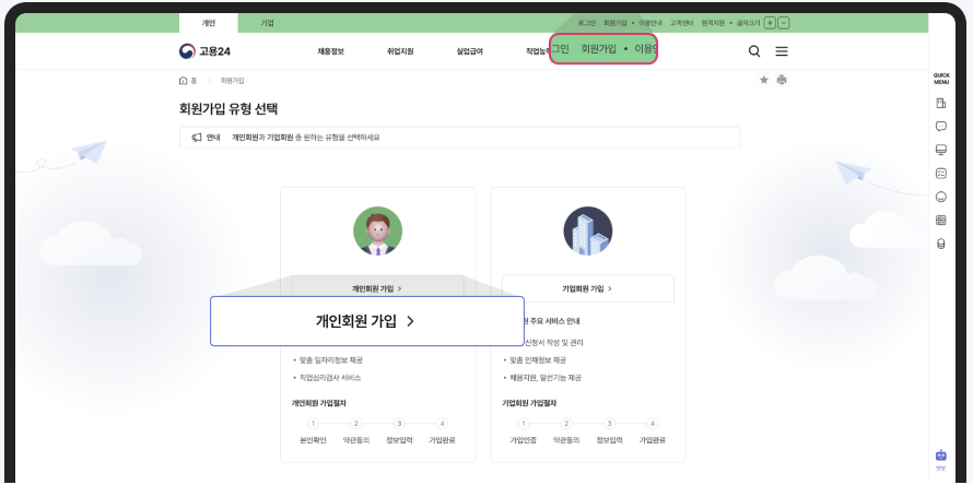 - 회원가입 버튼 클릭: 고용24 홈페이지 메인 화면에서 '회원가입' 버튼을 클릭합니다.