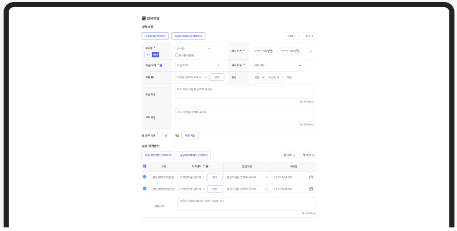 - 학력, 경력, 자격증 등 모든 항목을 빠짐없이 기재합니다.