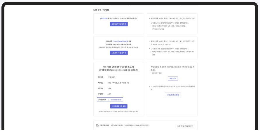 로그인 후, 마이페이지에서 구직 신청 상태를 실시간으로 확인할 수 있습니다. 구직 신청이 정상적으로 접수되었는지, 취업 알선이 진행되고 있는지 등의 정보를 확인할 수 있습니다.