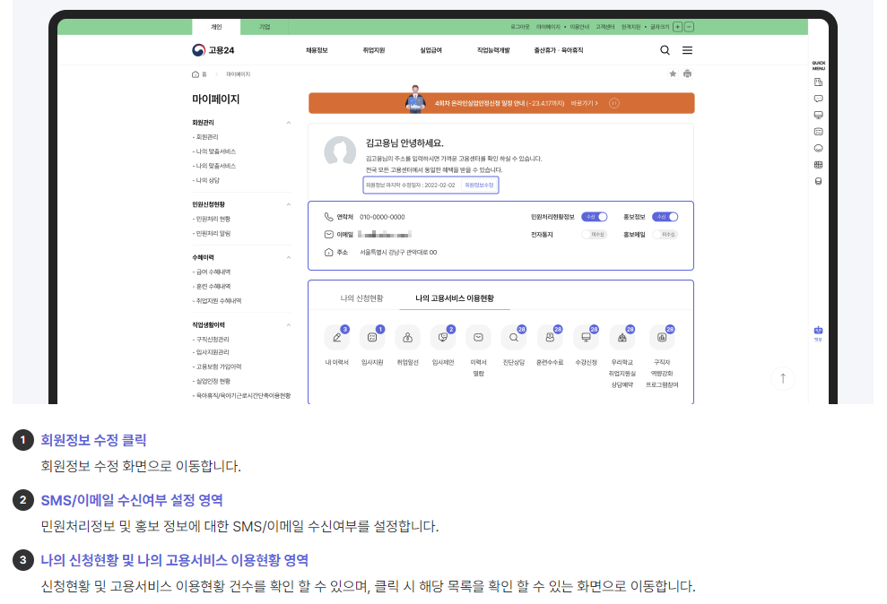 - 이메일 주소 입력: 추후 고용24 관련 알림을 받을 수 있는 이메일 주소를 입력합니다.