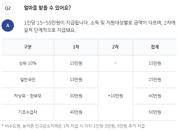 이러한 차등 지급은 지역 간 경제 회복 속도나 물가, 생활 수준 등을 고려해 설계된 것으로, 지원의 형평성을 맞추기 위한 조치입니다. 예를 들어 기초생활수급자가 농어촌에 거주하고 있다면 총 48만 원을 받게 되며, 2차 지급 시 추가 10만 원을 더해 최대 58만 원까지 수령할 수 있습니다.
