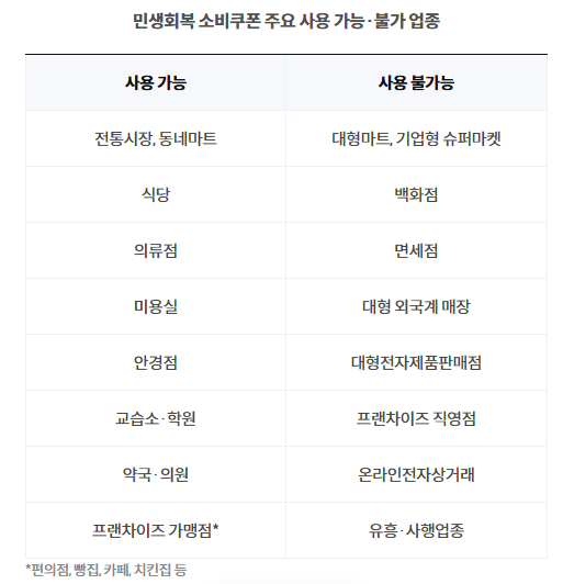 대표적으로 연매출 30억 이하의 소상공인 가맹점에서 사용이 가능하며, 전통시장, 동네마트, 미용실, 안경점, 의원, 학원 등 지역 기반 업소 대부분에서 사용 가능합니다.