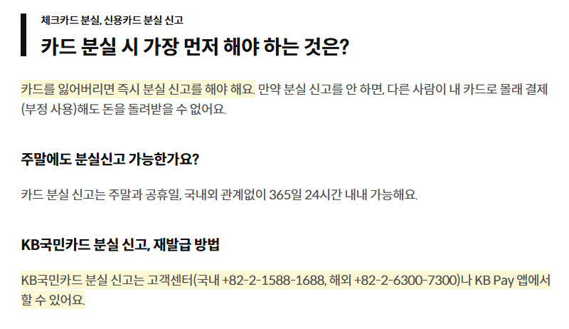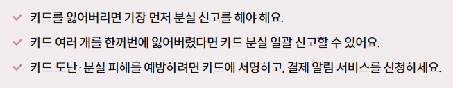 | 국내에서 카드 분실 | 즉시 신고 | 1588-1788, 1588-1688 |