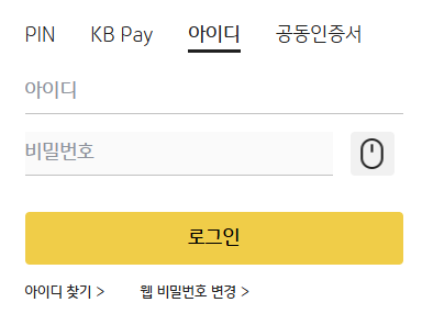 | 로그인 방식 | 공동인증서, KB모바일 인증, 간편 비밀번호 |