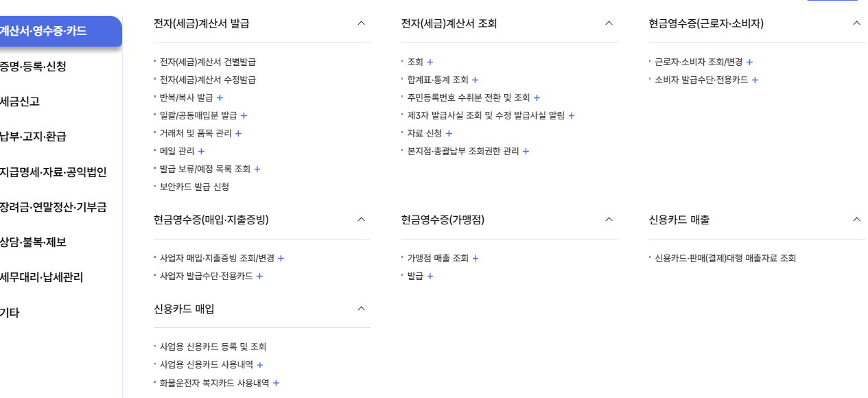 A. 네. 사업자는 ‘매출내역’ 또는 ‘매입증빙’으로 구분되어 표시되며, 개인은 ‘소득공제용’ 중심으로 정리됩니다. 따라서 메뉴도 약간 다르게 구성됩니다.