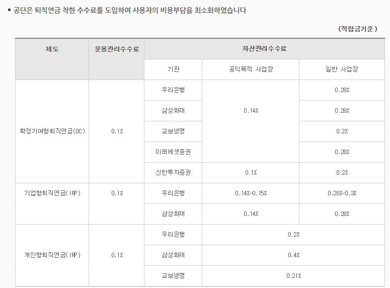 공단의 퇴직연금은 확정급여형(DB), 확정기여형(DC), 개인형퇴직연금(IRP)으로 나뉩니다.