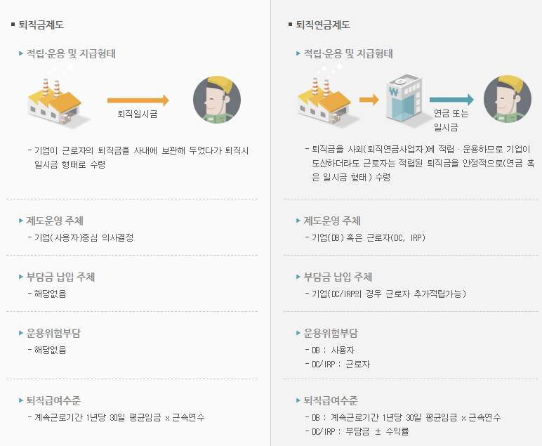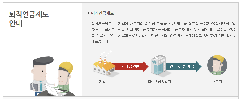| 기업(사용자) 메뉴 | 부담금 납부 내역 조회, 신규 가입 신청, 가입자 명부 관리 | 사업주가 근로자의 퇴직연금을 관리하고 불입하는 창구 |