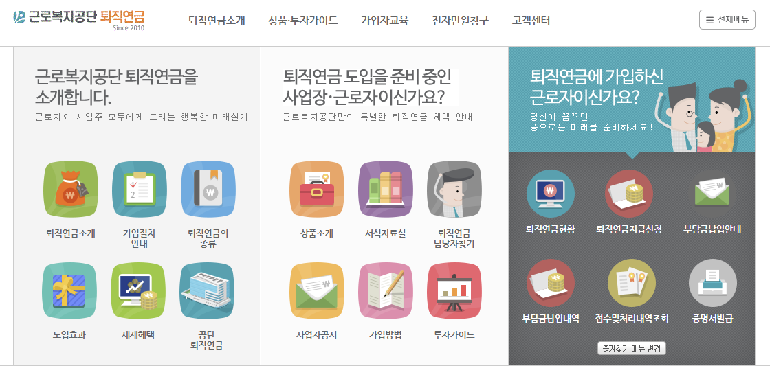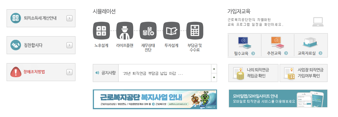 근로복지공단 퇴직연금 홈페이지 메뉴 구성 요약