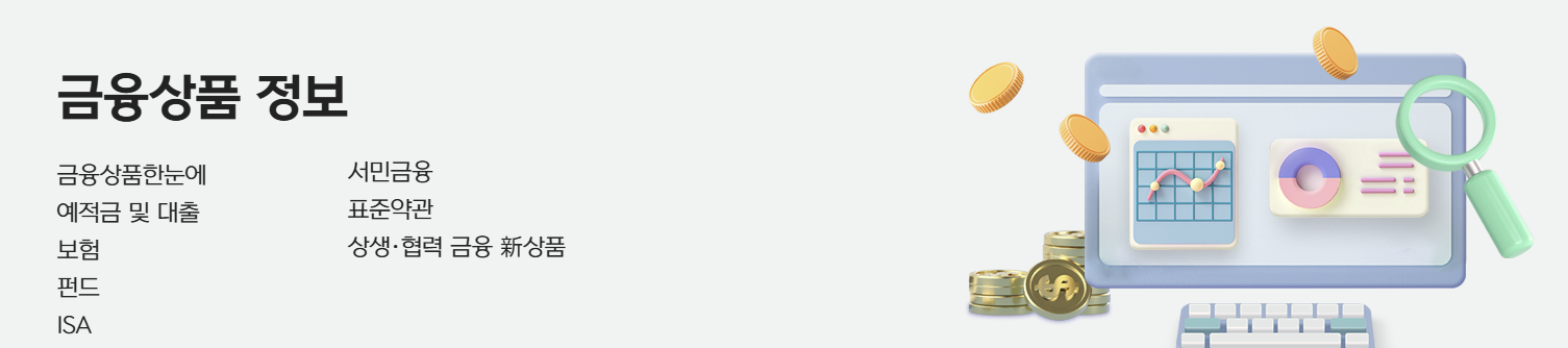 | 상품 비교 | 예금·대출·보험 등 비교 | 직접 판매보다 비교와 정보 확인의 출발점에 가까움 |