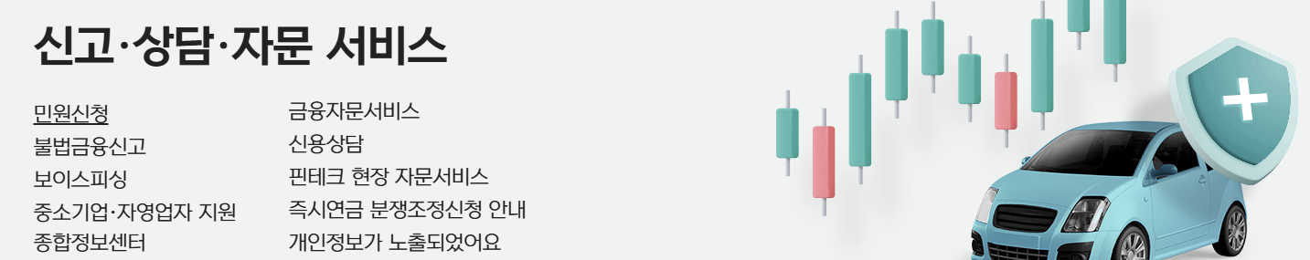 | 소비자보호 | 소비자경보, 금융생활가이드, 분쟁조정사례 | 평소엔 안 써도 꼭 알아둘 만한 메뉴 |