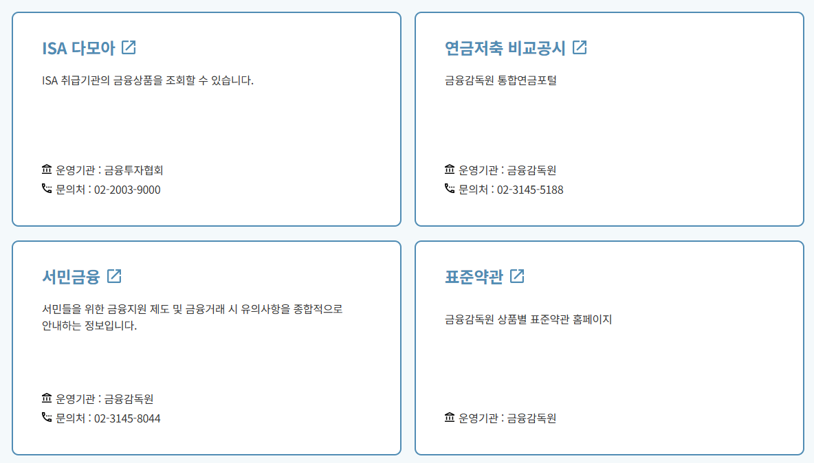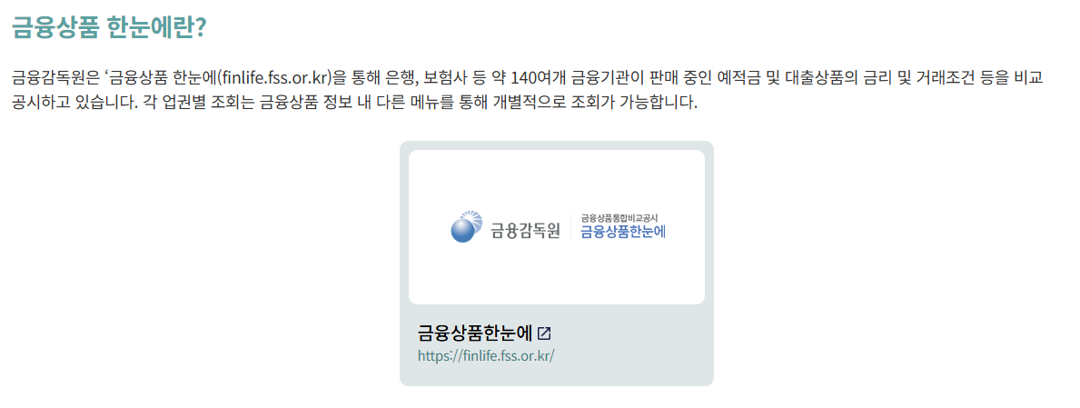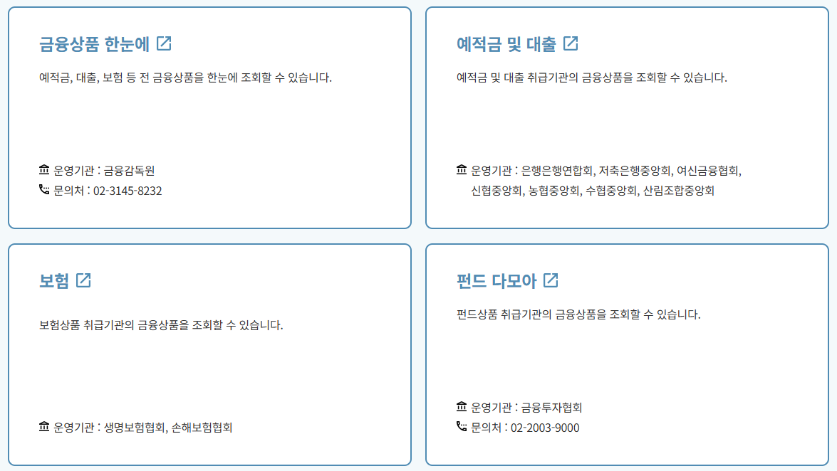 | 사이트 성격 | 금융감독원 금융소비자 정보 포털 | 거래 사이트보다 정보·조회·비교 포털에 가까움 |