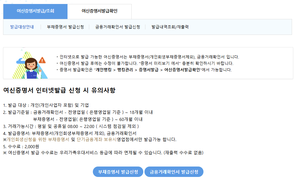 우리은행 | 인터넷뱅킹 > 뱅킹관리 > 여신증명서 발급 > 금융거래확인서 신청 가능 |