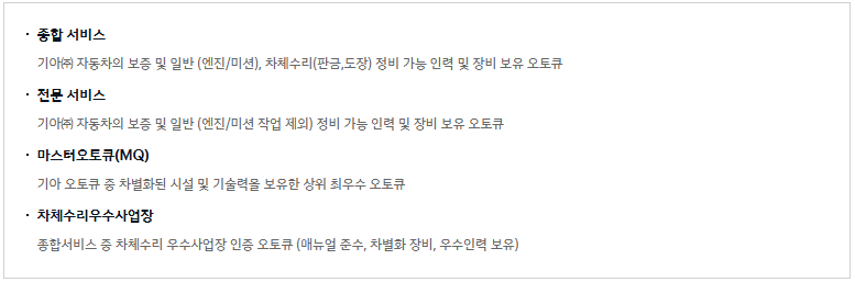오토큐는 기아차의 공식 서비스 브랜드로, 전국에 약 800여 개의 정비소가 운영되고 있습니다. 직영 서비스센터보다 접근성이 높고, 기본적인 정비와 수리를 받을 수 있는 곳으로 많은 고객이 이용하고 있습니다.