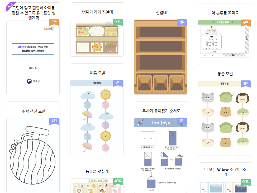 꼬망세의 핵심 기능 중 하나는 연령별·주제별로 체계화된 수업 자료를 검색하고 다운로드할 수 있다는 점입니다. 자료는 보통 만 0세부터 만 5세까지의 유아를 대상으로 구성되어 있으며, 계절별·행사별 자료도 함께 제공됩니다.