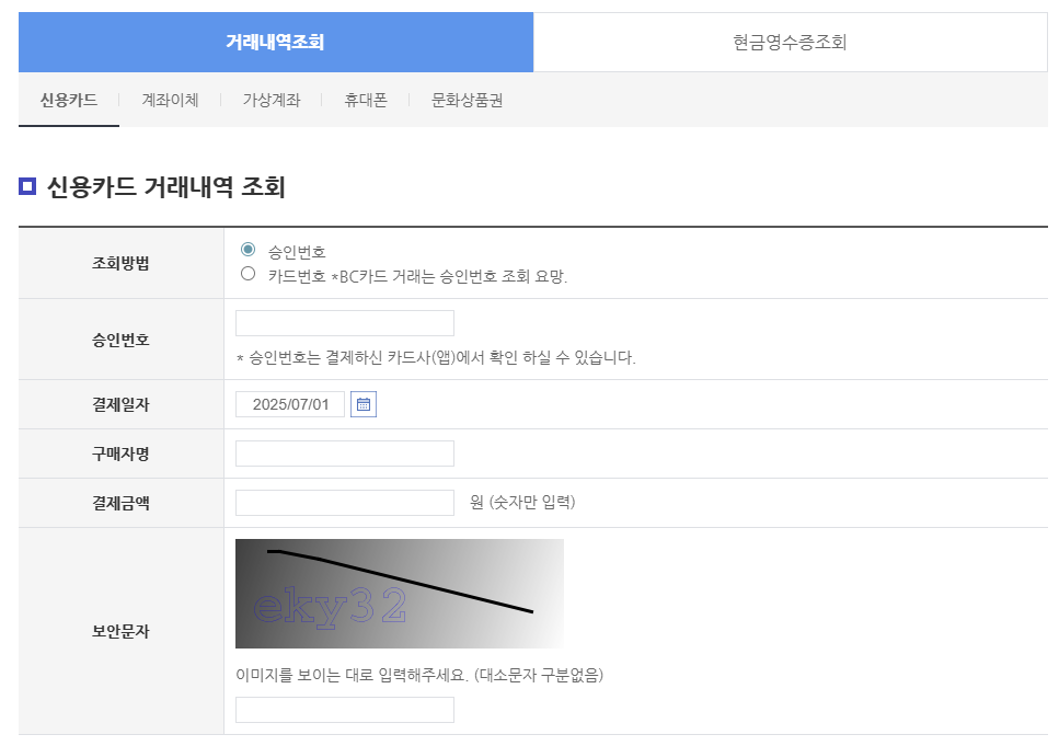 | 입력 항목 | 카드번호/승인번호, 결제일, 구매자명, 이메일 |