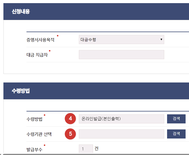 - 수령 방법: '온라인 발급(본인 출력)'을 선택합니다.