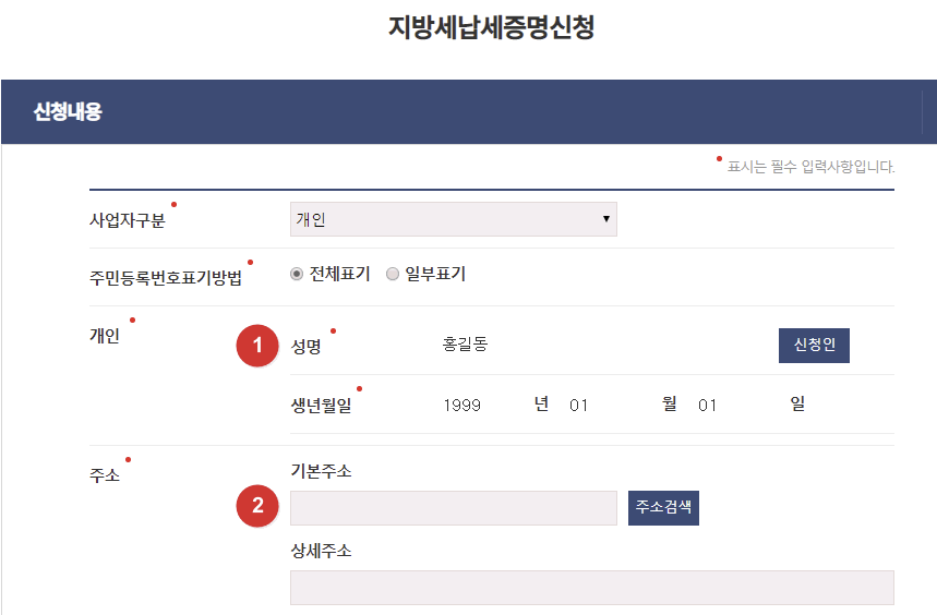 - 기본 인적 사항(주민등록번호, 성명, 주소)은 로그인 정보에 따라 자동으로 채워집니다.