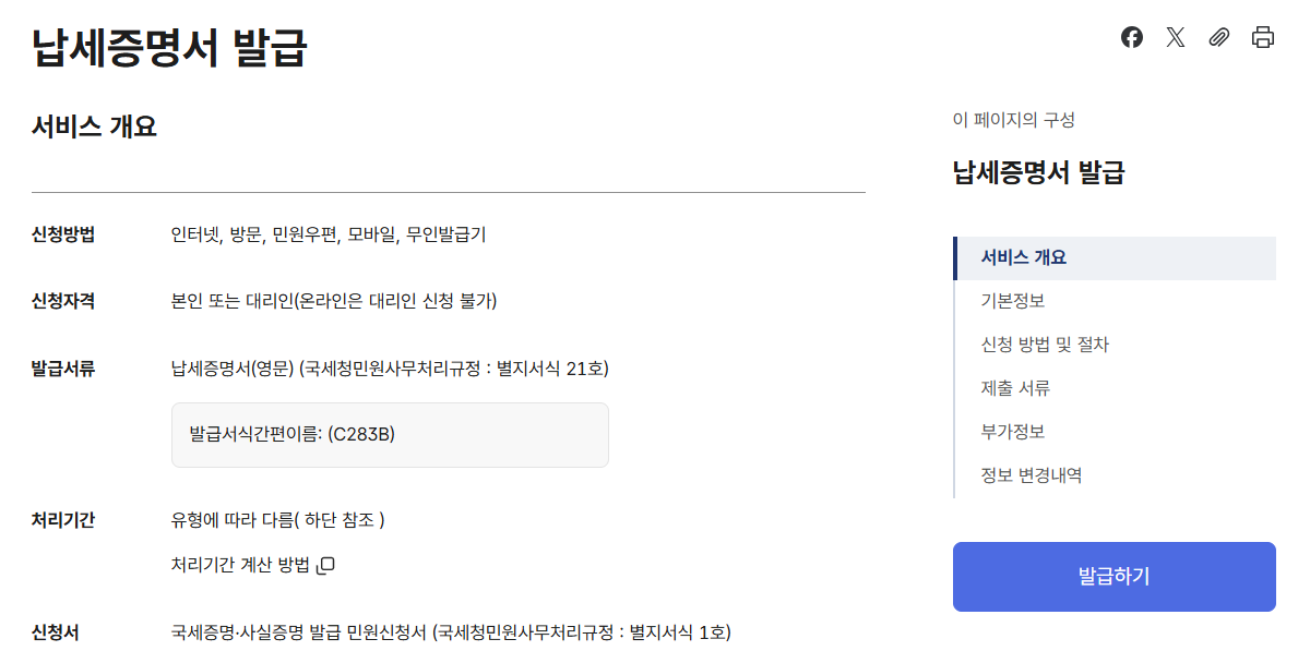 | 구분 | 국세 납세증명서 (National Tax) | 지방세 납세증명서 (Local Tax) |