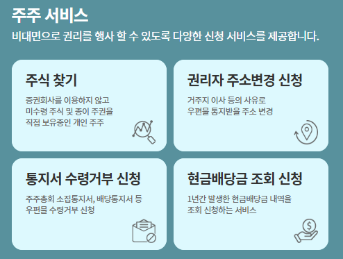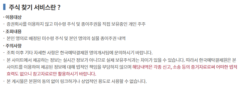 이 서비스는 특히 오래된 주식이나 상장폐지된 종목을 찾는 데 유용합니다. 제 지인은 이 서비스를 통해 과거 상장폐지된 회사의 주식이 본인 명의로 남아 있음을 확인하고 정리한 경험이 있었습니다.