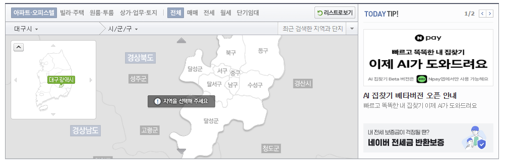 네이버 부동산 메인 화면은 크게 검색창, 지역별 매물 정보, 뉴스·시세 코너로 구성됩니다.