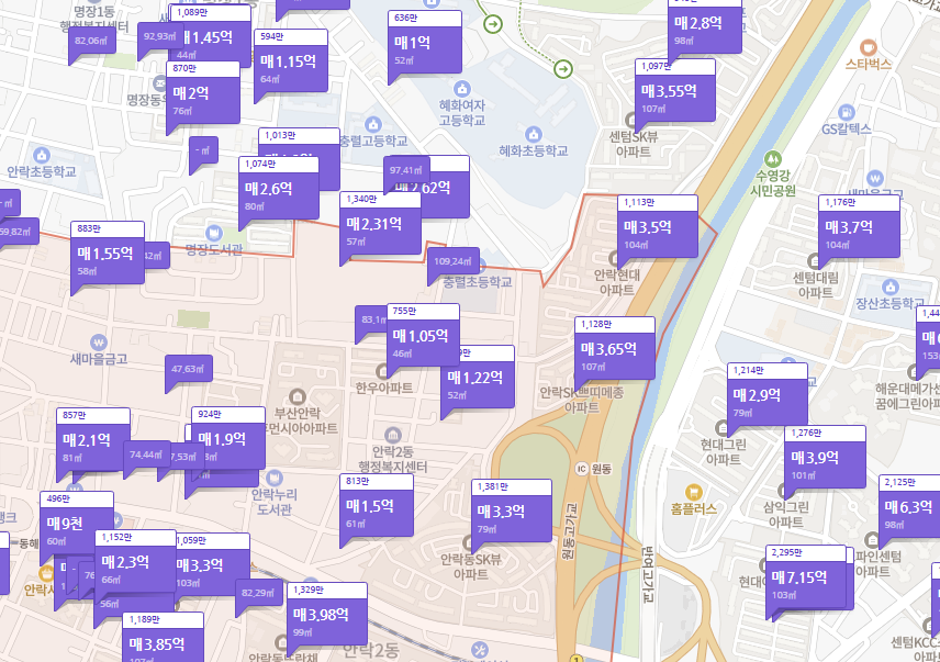 - 지역별 매물 정보: 지도 기반으로 매물 위치와 가격이 표시되어 직관적으로 확인 가능합니다.