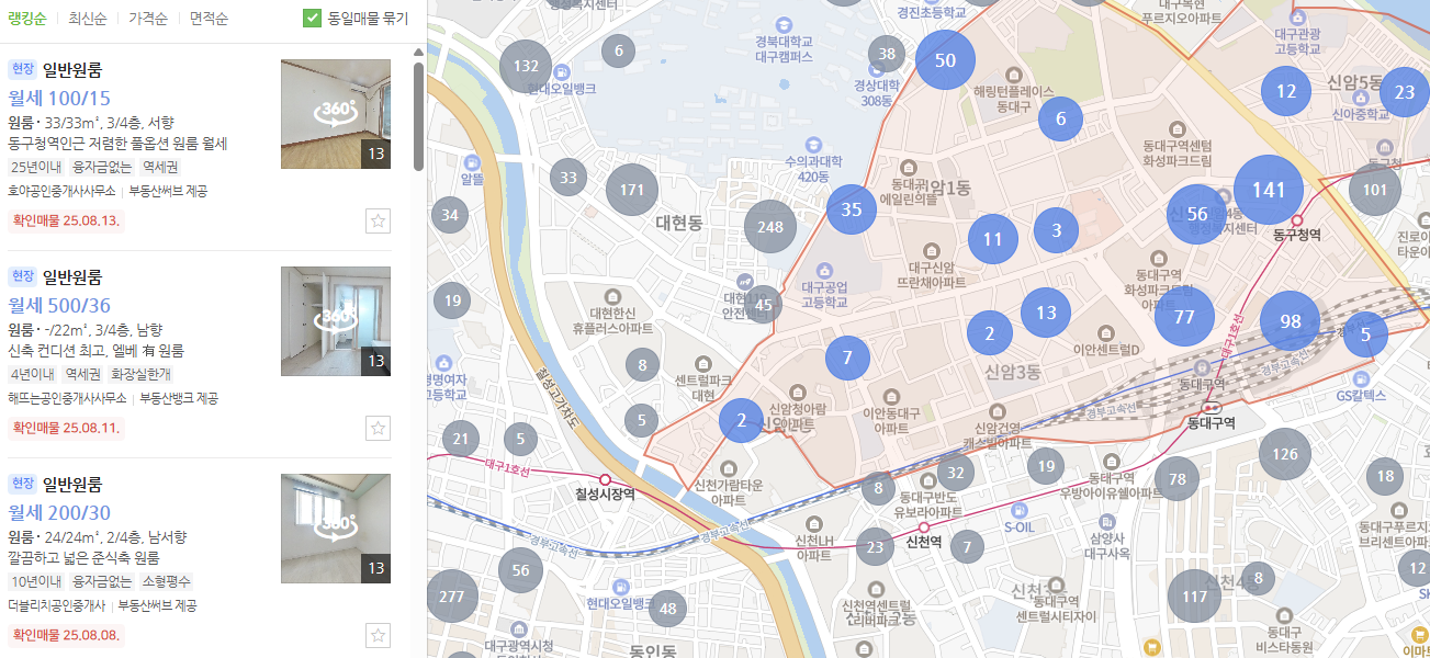 특히 지도 기반 검색은 확대·축소에 따라 해당 지역 매물이 자동으로 업데이트되며, 가격 필터나 면적 필터를 적용해 원하는 조건에 맞게 결과를 좁힐 수 있습니다.