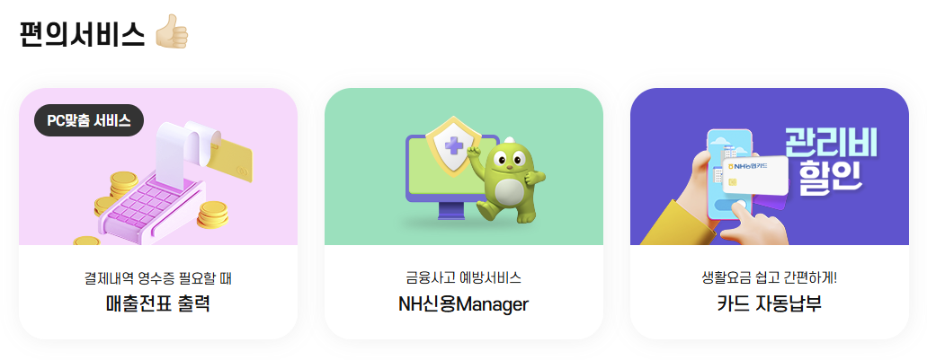 농협BC카드 홈페이지 주요 기능