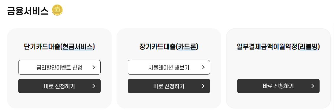 - 일정 금액 이상의 대출이 필요한 경우 카드론을 신청할 수 있으며, 장기 상환 옵션이 제공됩니다.