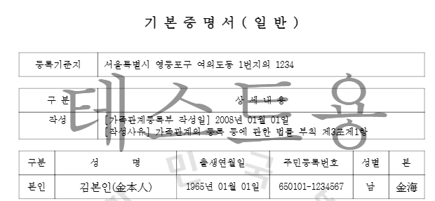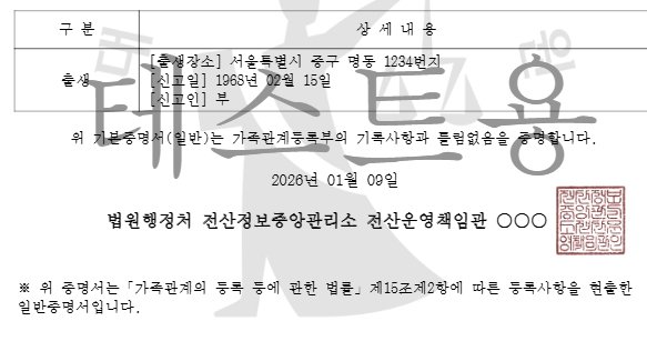 | 일반 증명서 | 본인과 부모, 배우자, 현재 혼인 중인 자녀만 표시 | 통상적인 신분 증명, 학교 제출용 |