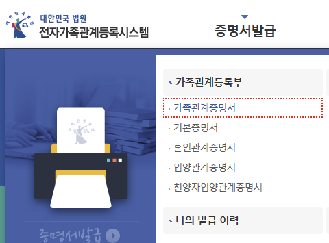 - 홈페이지 메인 접속: 첫 화면 상단에 위치한 '증명서 발급' 메뉴에서 '가족관계증명서' 아이콘을 클릭합니다.