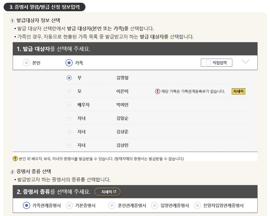 | 특정 증명서 | 신청인이 선택한 특정인과의 관계만 표시 | 사생활 보호가 필요한 관계 증명 |