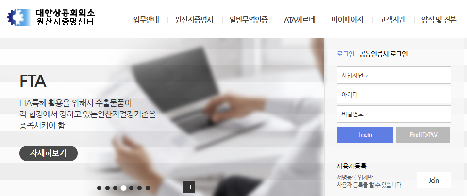 - 대한상공회의소 원산지증명센터(https://cert.korcham.net)에 접속하여 회원가입을 진행합니다.
