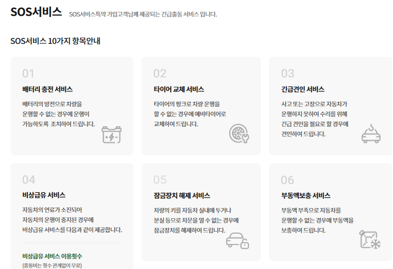 | 타이어 교체 | 예비 타이어 보유 차량 대상, 무료 교체 |