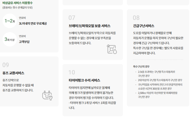 | 긴급 견인 | 기본 견인 거리 이내 무료, 초과 시 추가 비용 발생 |