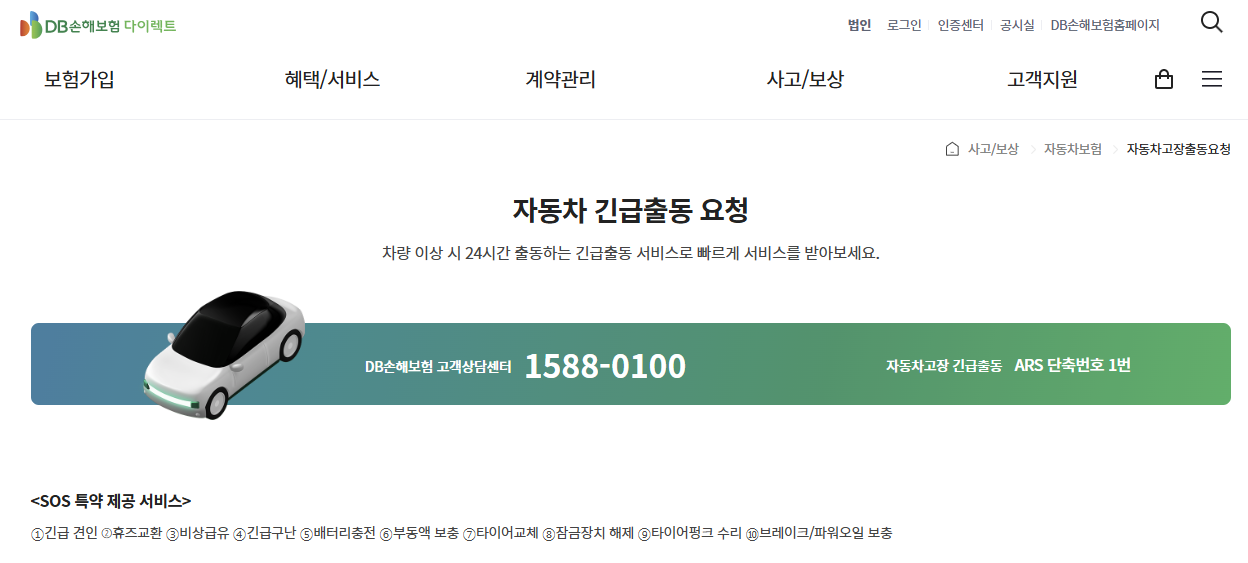 - DB다이렉트 공식 웹사이트에 접속하여 긴급출동 신청 메뉴를 선택합니다.