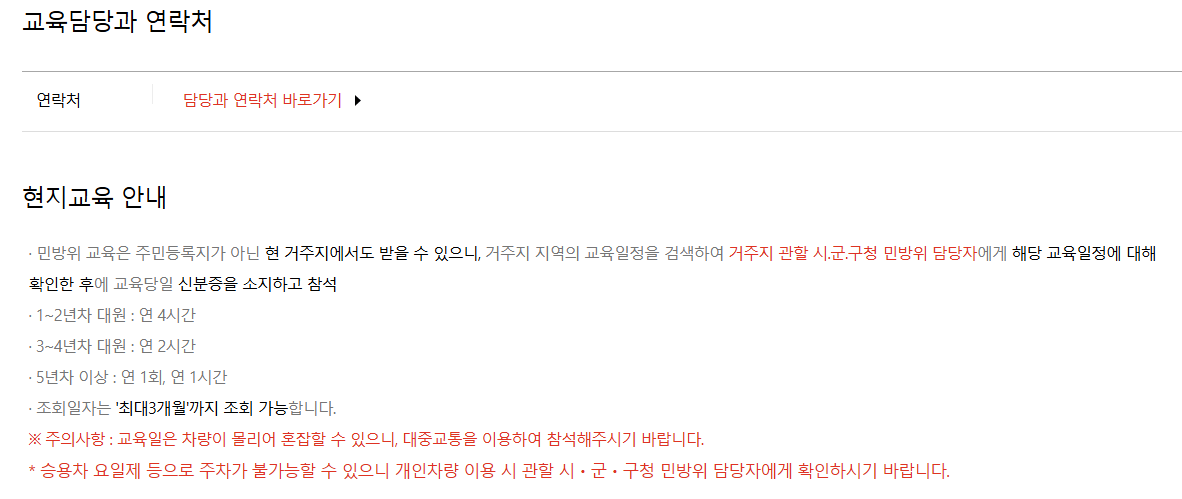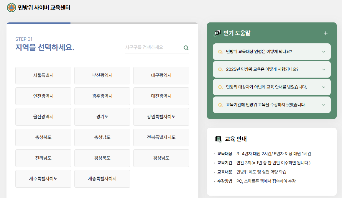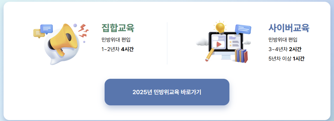 민방위 사이버교육은 만 20세 이상부터 편성되는 민방위 대원이 매년 받아야 하는 민방위 교육 중, 비대면 방식으로 진행되는 온라인 강의입니다. 각 지자체에서 민방위 연차별로 집합교육 또는 사이버교육 여부를 구분하며, 보통 2~5년차 대원이 사이버교육 대상에 포함됩니다. 일부 지자체에서는 1년차 대원도 사이버교육을 허용하고 있으며, 6년차 이상은 통지 여부에 따라 교육을 면제받기도 합니다.