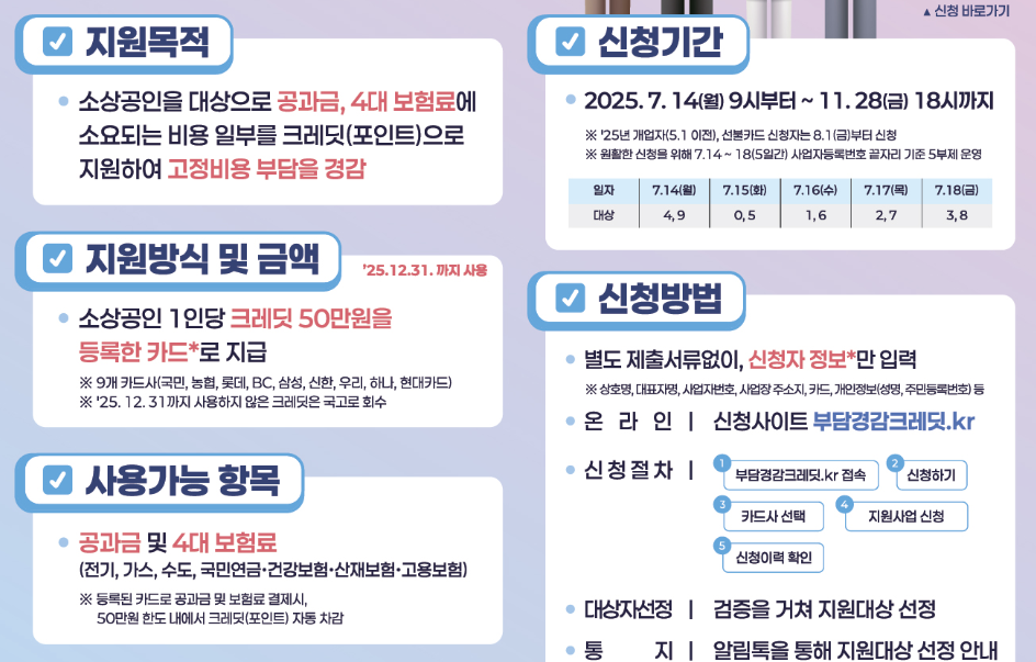 부담경감 크레딧의 신청 기간은 2025년 7월 14일(월) 오전 9시부터 시작되어 11월 28일(금) 오후 6시까지 운영됩니다. 다만, 초반 신청이 몰릴 것을 고려해 7월 14일부터 18일까지는 사업자등록번호 끝자리에 따라 5부제를 적용합니다.
