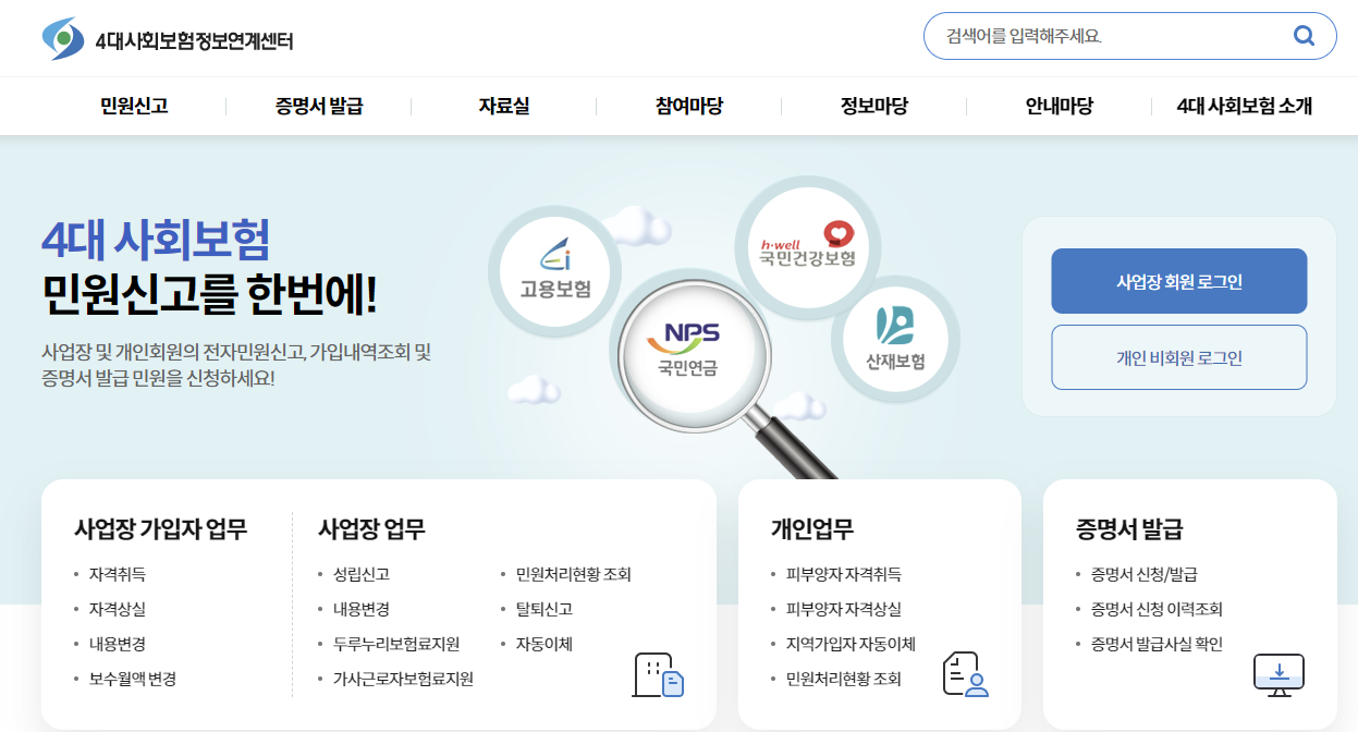모든 보험을 개별적으로 확인하고 출력해야 하는 번거로움을 줄이기 위해, 4대보험 정보연계센터에서 한 번에 4대 보험 관련 정보를 통합 조회하고 관리할 수 있습니다.