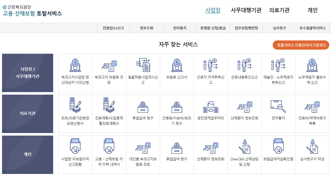 산재보험 가입자명부도 고용노동부의 고용·산재보험 토탈서비스를 통해 발급 가능합니다.