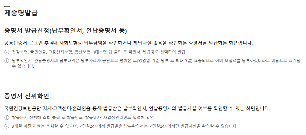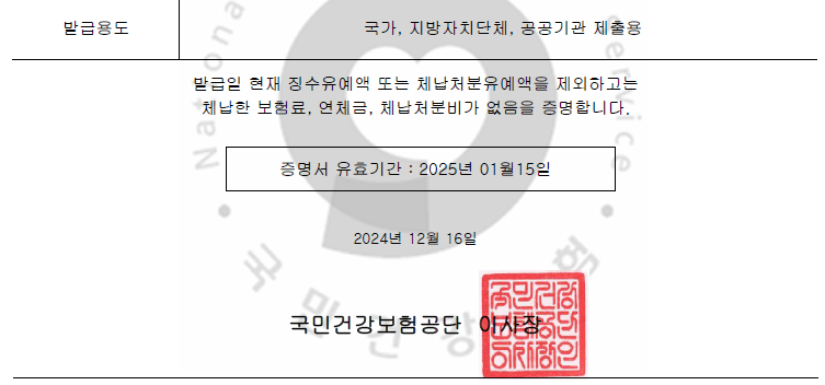 또 한 가지 주의할 점은 보험료가 완납된 상태에서만 증명서가 발급된다는 것입니다. 보험료가 일부라도 미납된 상태라면 발급이 거부되며, 이 경우 먼저 미납금 정산을 완료해야 합니다. 또한 납부 직후에는 시스템 반영까지 1~2일이 소요될 수 있으므로, 급하게 발급이 필요하다면 미리 납부하고 기다리는 여유가 필요합니다.