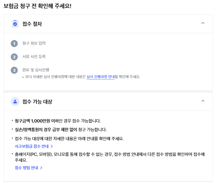 온라인 청구 역시 모바일 앱과 마찬가지로 빠른 처리가 가능하며, 청구 금액이 소액인 경우 3일 이내에 지급됩니다.