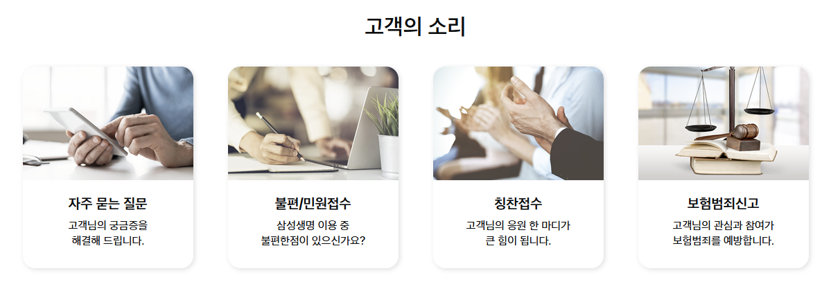 - 지점 안내: 전국 삼성생명 지점의 위치, 운영시간, 연락처를 확인할 수 있습니다.
