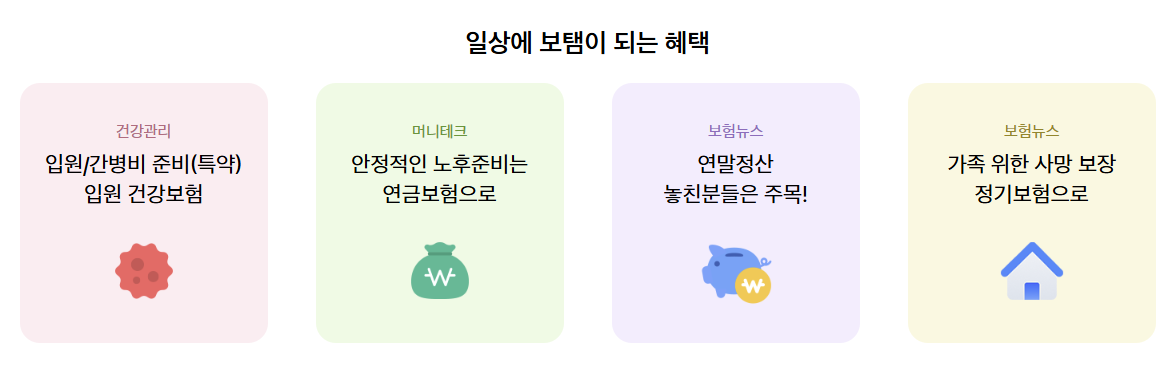 - 생명보험, 건강보험, 연금보험, 어린이보험, 종신보험 등 다양한 상품을 한눈에 볼 수 있습니다.