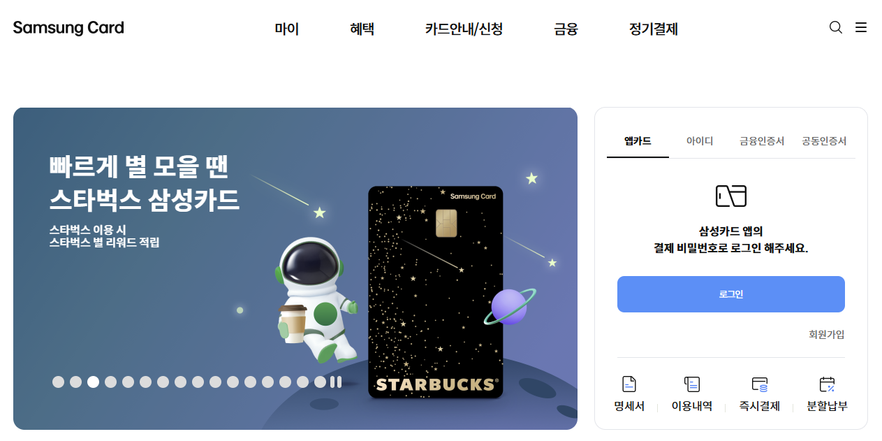 삼성카드 홈페이지에서 가장 많이 사용되는 메뉴입니다.