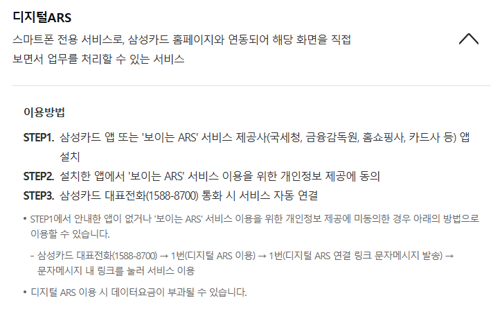 - 모바일 연동: 삼성카드 앱을 설치하면 홈페이지와 동일한 계정으로 이용할 수 있으며, 실시간 결제 알림을 받을 수 있습니다.