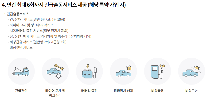 - 보험 약관 확인: 긴급출동 서비스는 가입한 보험 상품에 따라 제공 범위가 다를 수 있습니다. 사전에 약관을 확인하십시오.